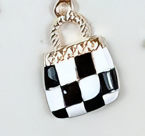 The Checkered Pattern Purse Pendant Earrings are a stylish and contemporary accessory choice. These earrings showcase miniature purse-shaped pendants adorned with a classic checkered pattern. The design offers a blend of modern fashion and a timeless print, making them versatile for various occasions. The checkered pattern adds a touch of sophistication and style, while the purse shape lends an element of playful elegance. Whether you're dressing up for a chic evening out or looking to elevate your everyday attire, these earrings are an ideal choice. They bring a hint of fashion-forward flair to your look, making a statement that's both trendy and tasteful, making them a must-have addition to your jewelry collection.
