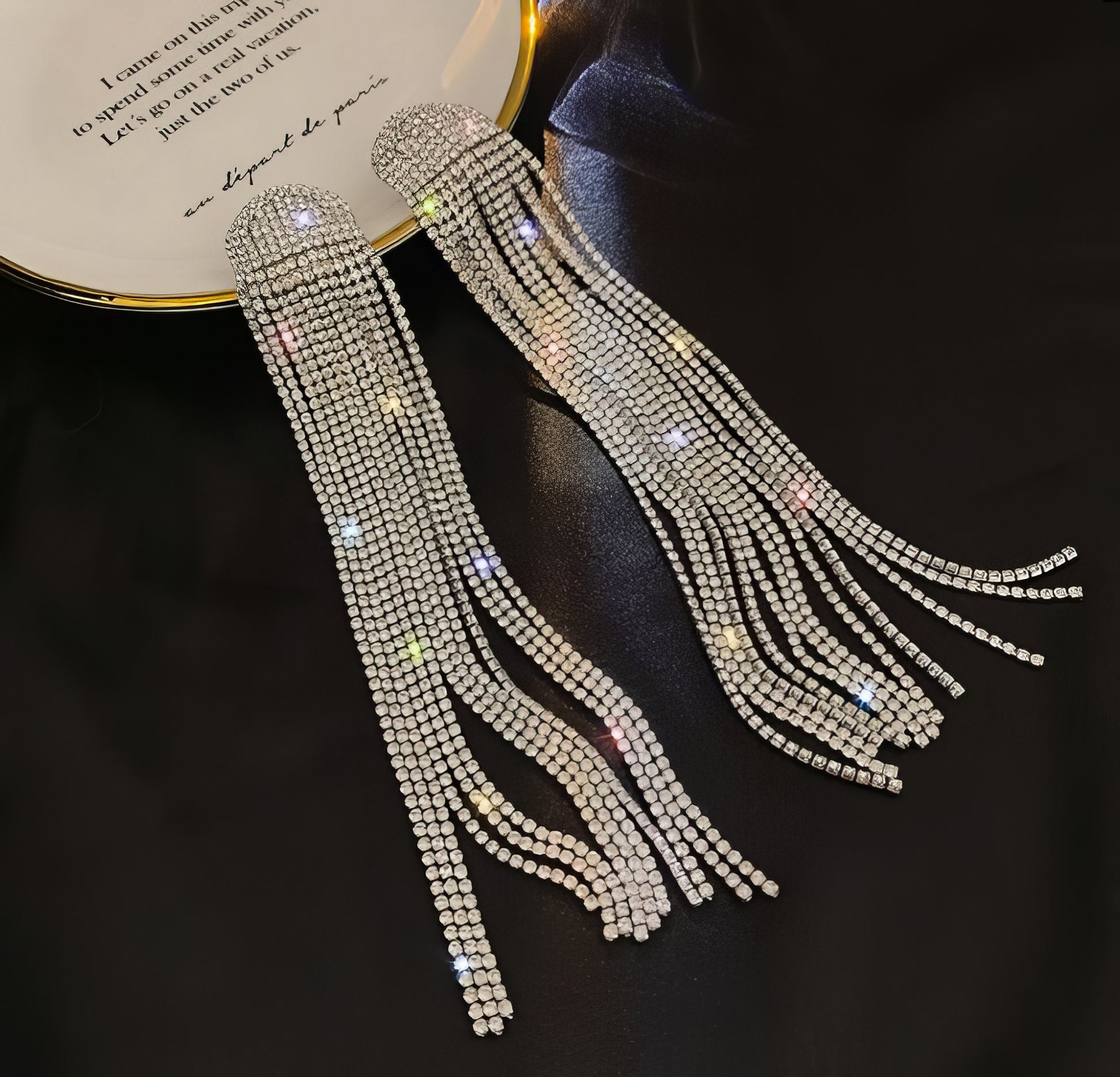 Make a bold and glamorous statement with the Crystal Rhinestone 6.5-inch Flowing Water Drop Dangle Earrings. These earrings are designed to captivate and mesmerize with their elegant and flowing design. The elongated water drop shape creates a stunning silhouette that gracefully cascades down, drawing attention and adding a touch of drama to your look. The shimmering rhinestones are meticulously set, catching the light and creating a dazzling display of sparkle. The 6.5-inch length allows these earrings to beautifully frame your face, accentuating your features and adding a touch of sophistication. Whether you're attending a special occasion or want to elevate your everyday style, these earrings are sure to make a statement. Embrace their enchanting beauty and let them effortlessly enhance your overall ensemble, leaving a lasting impression wherever you go. Let your inner glamour shine through with these stunning Crystal Rhinestone Flowing Water Drop Dangle Earrings.