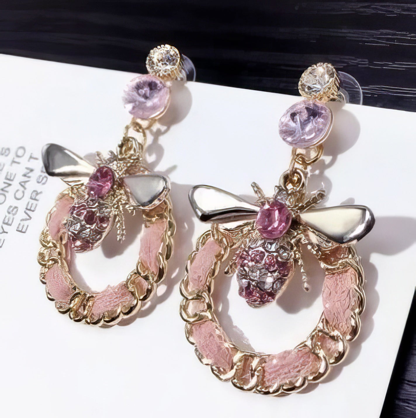 Designer Inspired Rhinestone Bee Hoop Earrings in Pink and Gold