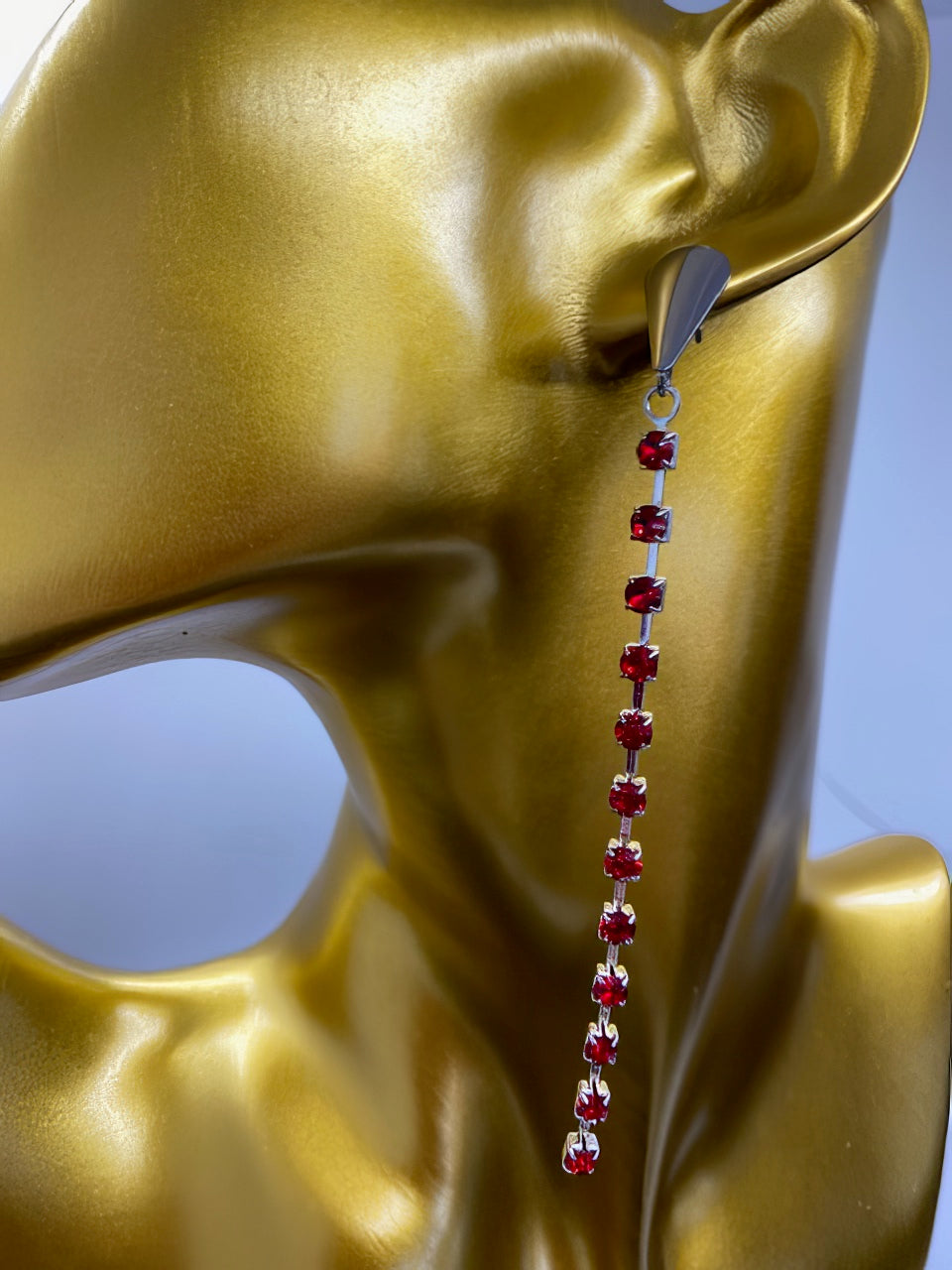 The Red Chain Rhinestone Drop Earrings feature a dazzling chain design adorned with sparkling rhinestones, adding glamour to any outfit. With their versatile silver tone finish, these earrings effortlessly complement both formal occasions and everyday looks. The Chain Rhinestone Drop Earrings are the perfect accessory for those seeking to make a bold fashion statement, exuding confidence and style everytime you wear them. These earrings are sure to captivate and sparkle.