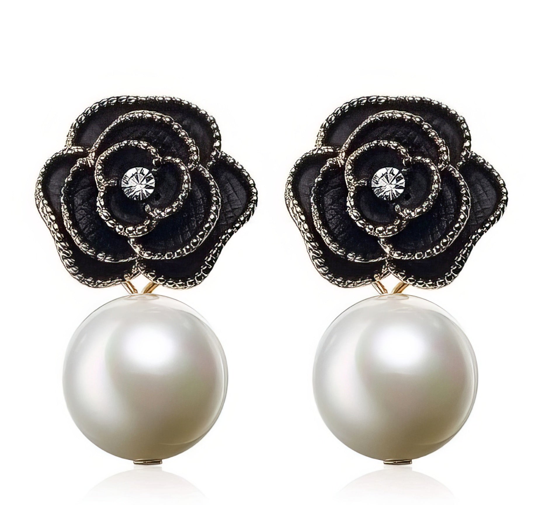The Silver Rose Gold Pearl Pendant Camellia Earrings are inspired by the iconic camellia flower. The design features lustrous pearl elegantly suspended from a meticulously crafted camellia-shaped setting centered with a Rhinestone. Each delicate petal is adorned with shimmering crystals, adding a touch of sparkle and glamour to the overall design. The attention to detail and craftsmanship is exceptional, ensuring a flawless and captivating accessory. Wear themfor a special occasion or or out on the town, these earrings are a true statement piece.