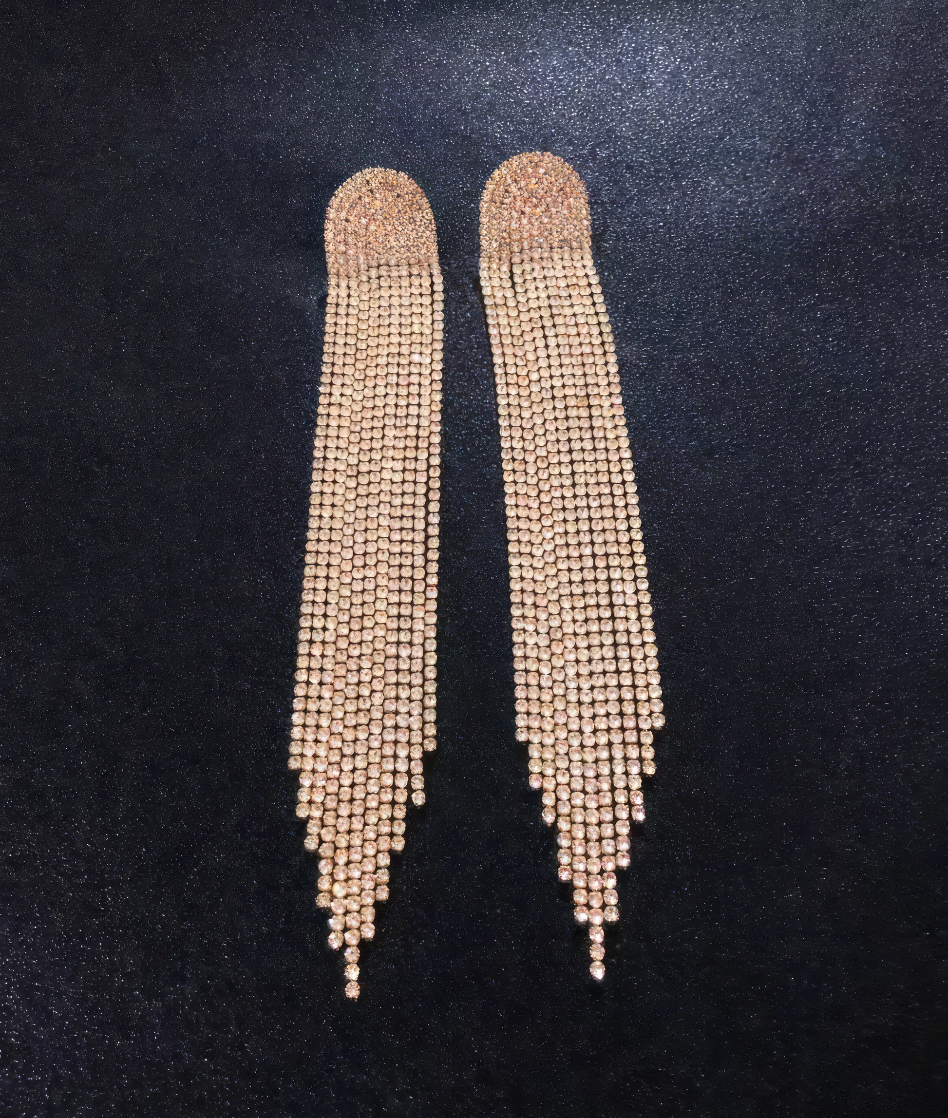 The Rhinestone Long Tassel Chain Arched Pendant Earrings are a captivating fusion of modern elegance and intricate design. These exquisite earrings feature arched pendant designs adorned with sparkling rhinestones, elegantly suspended from long tassel chains. Meticulously crafted, these earrings capture the essence of sophistication and trend-setting style, creating accessories that add a touch of glamour to any ensemble. The shimmering rhinestones exude a radiant sparkle, while the tassel chains create graceful movement, reflecting light in a mesmerizing dance. The Rhinestone Long Tassel Chain Arched Pendant Earrings serve as symbols of contemporary allure and individuality, reflecting the wearer's unique fashion sense and appreciation for accessories that make a statement. Whether worn as standalone statement pieces or paired with other earrings, they embody both modern flair and timeless charm, making them treasured additions to any jewelry collection. These earrings seamlessly blend modern aesthetics with captivating design, capturing the wearer's distinctive personality and love for bold and stylish adornments.