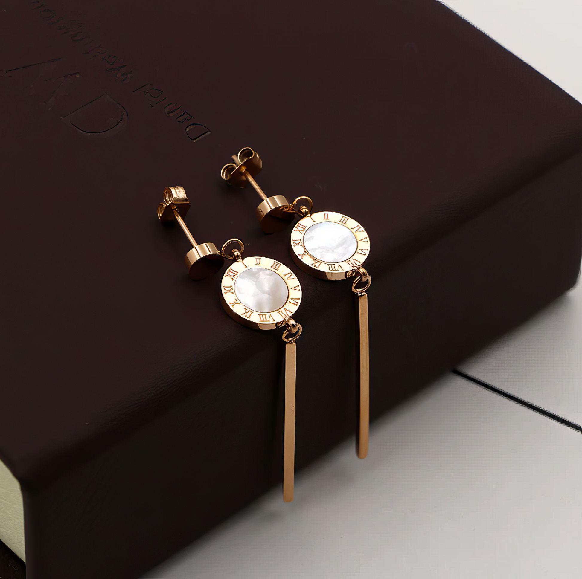Roman Numerals Dangle Earrings in Rose Gold in White